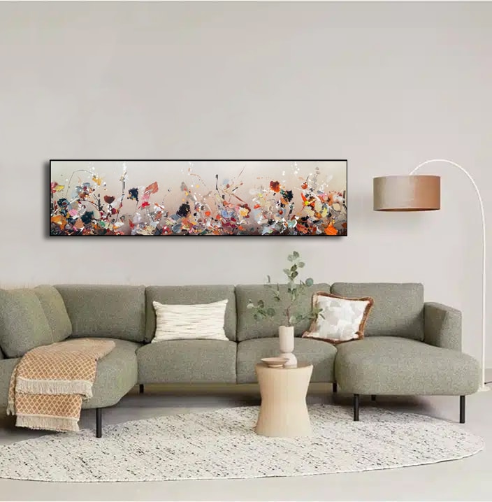 Martine schildert haar wilde veldbloemen met paletstukken op groot formaat doek (bijvoorbeeld 50×200 cm) in vele kleurencombinaties. Dit doet ze ook in opdracht waarbij ze zich graag laat inspireren door de kleuren uit het interieur.