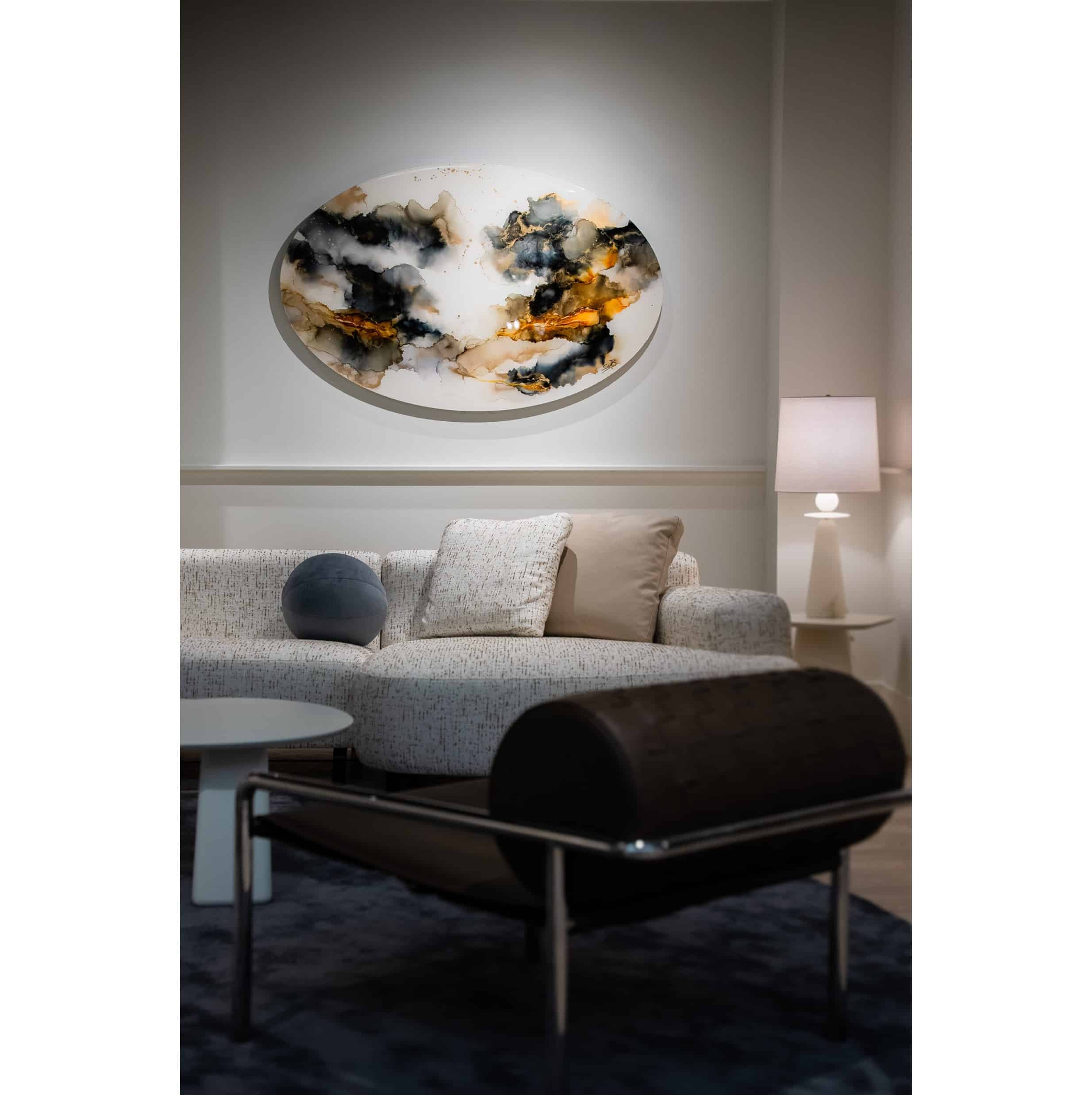 Met behulp van een zelfontwikkelde techniek gebaseerd op luchtdiffusie en vloeibare media, leid beeldend kunstenares Stephanie van der Beek de kleuren over het oppervlak in zachte, organische bewegingen. Laag voor laag krijgt elk werkstuk intuïtief vorm.