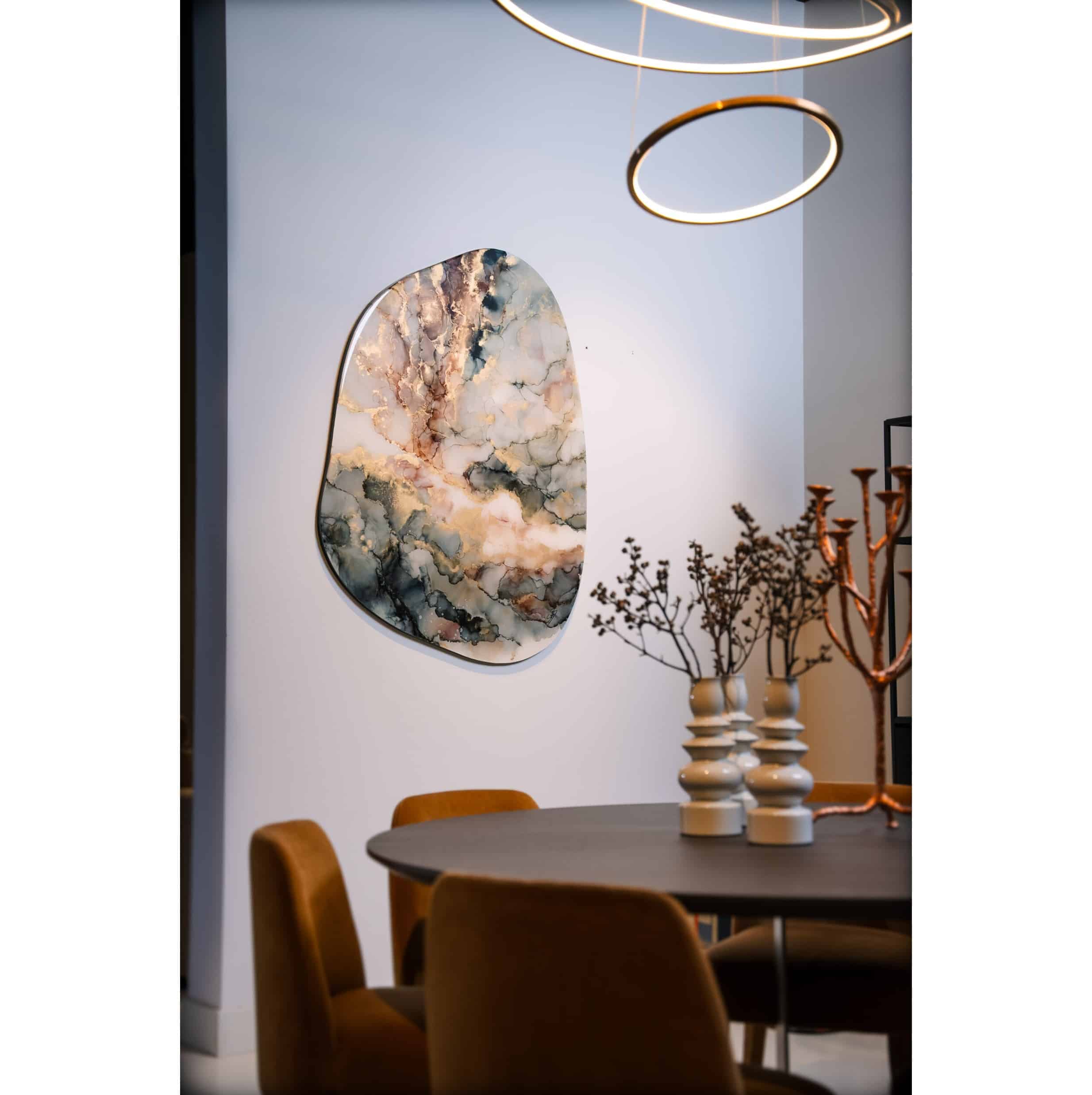2. Het oppervlak een spiegelende en haast sculpturale presentatie geeft, waardoor de tweedimensionale schilderkunst een extra ruimtelijke dimensie verkrijgt.
