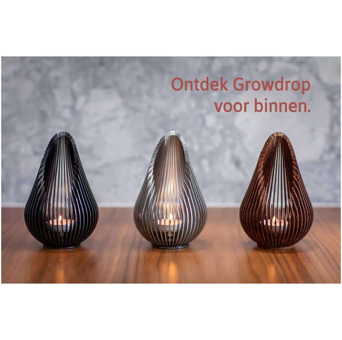 • Growdrop L kan gebruikt worden met een xl theelicht van 58 mm of een glazen windlicht van dezelfde afmeting.