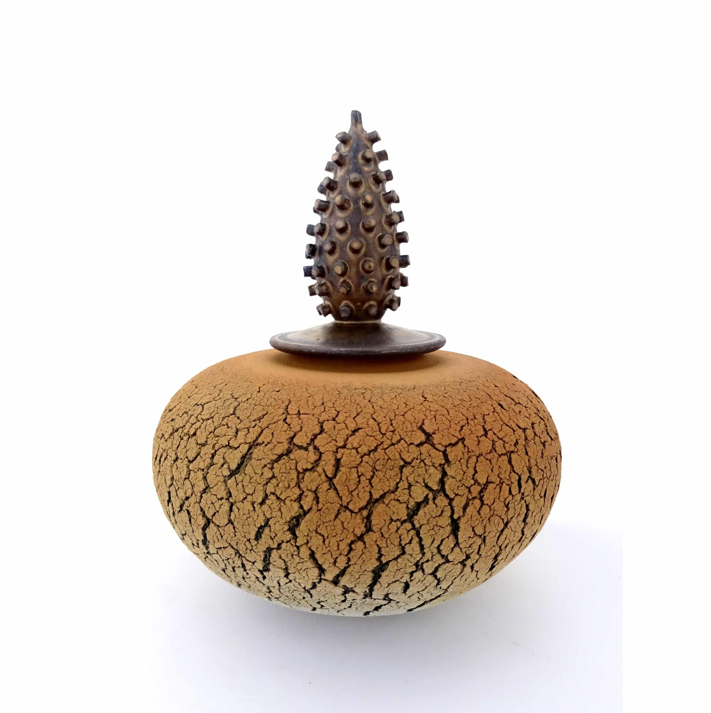 | Omschrijving | Oker pagodepot met studs op brons geglazuurde deksel |