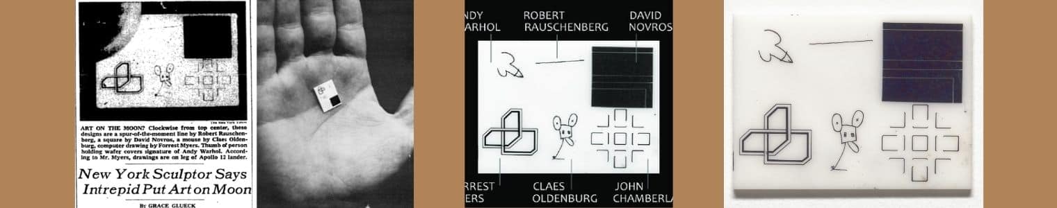 Toen de Apollo 12 in 1969 naar de maan vertrok, wilde beeldhouwer Forrest Myers dolgraag kunst naar de ruimte brengen. De NASA vond die ‘extra bagage’ echter maar niets. Myers liet zich niet stoppen en vroeg vijf iconische kunstenaars, waaronder Andy Warhol en Robert Rauschenberg, om een kleine tekening te maken. Hij liet de zes tekeningen verkleinen tot een keramisch plaatje van slechts 1,9 bij 1,3 centimeter— kleiner dan een postzegel.